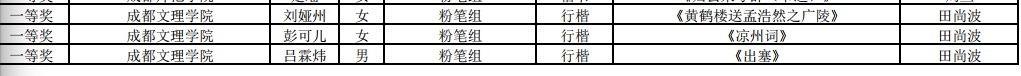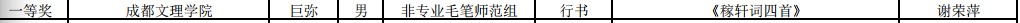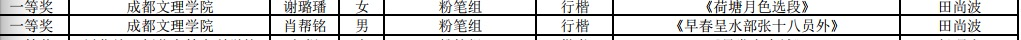 在此次竞赛中文法学院共有11位同学获得一等奖,分别是杨昕语、蔡芳、鄢杰茹、田毅、周伟凡(钢笔组);彭可儿、刘娅州、吕霖炜、谢璐璠、肖邦铭(粉笔组);巨弥(非专业毛笔组)。另外还有林玲、陈香伶、吴雨鑫等九位同学获得了二等奖,吕俊秀、杨盈盈、蔡李婷、张鑫等16位同学获得了三等奖。在此次比赛中文法学院的同学共计获得11个一等奖,9个二等奖,16个三等奖,总获奖数量为36个,与去年相比,今年比赛成绩再创佳绩,更上一层楼。