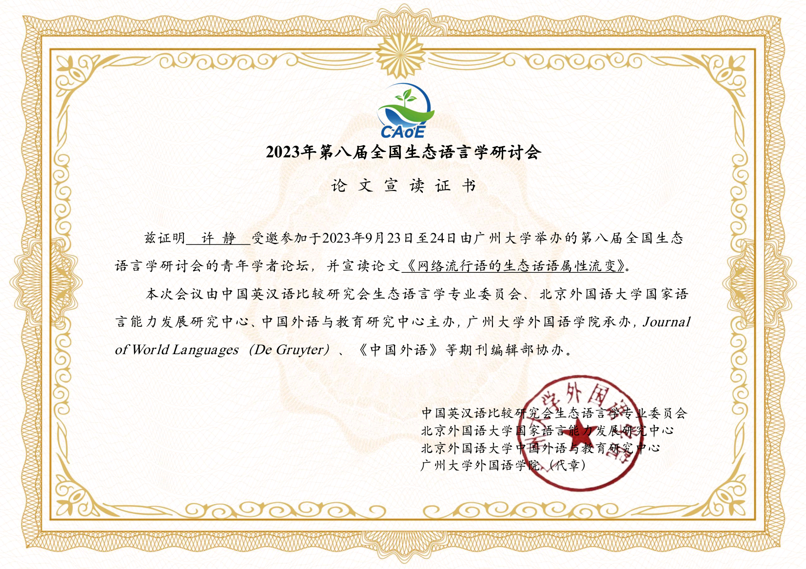 2023年9月23-24日,第八届全国生态语言学研讨会在广州大学成功举办。本次会议由中国英汉语比较研究会生态语言学专业委员会、北京外国语大学国家语言能力发展研究中心、中国外语与教育研究中心主办,广州大学外国语学院承办,Journal of World Languages (DeGruyter) 、《中国外语》等期刊编辑部协办。会议采用腾讯会议直播形式,来自全国100多所院校及科研机构的240余名学者、硕博研究生齐聚云端,共襄学术盛宴。