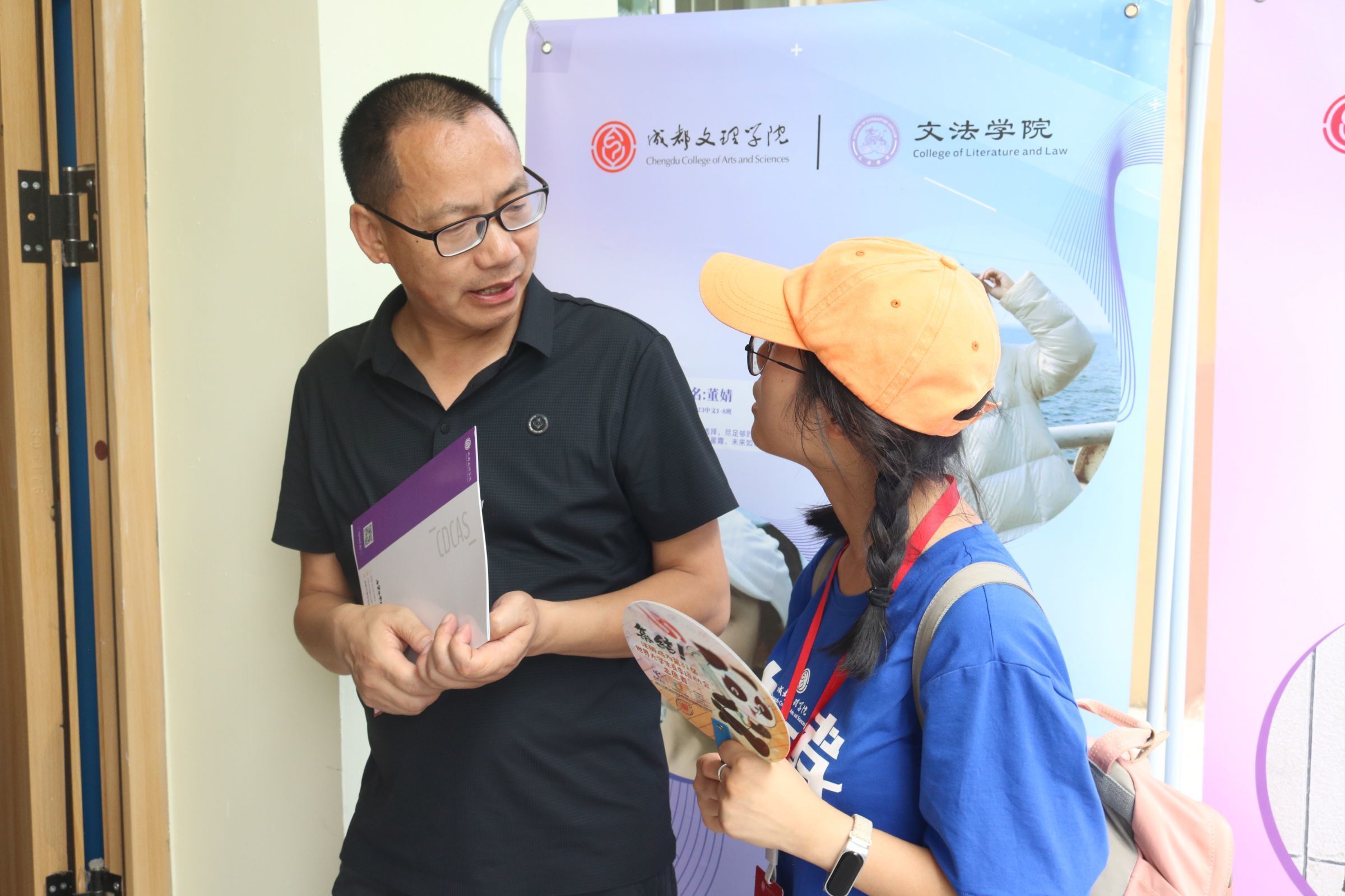 曹佳丽对学院的专业课程设置以及办学特色进行介绍。她指出学院始终坚持理论与实践相结合,文学专业创立了独特的书院教育制度,设立“弘博书院”;法学专业设有“五个实训室”,实现人才培养的专业化、精细化,为社会输送了大批优秀人才。
