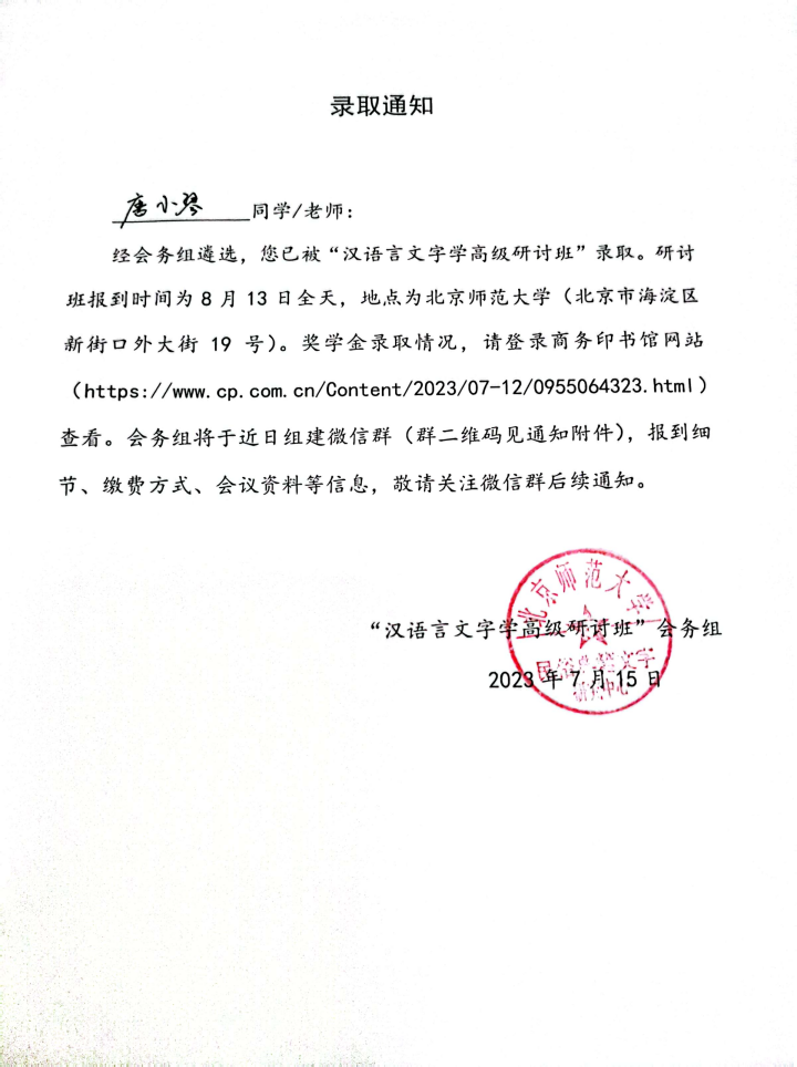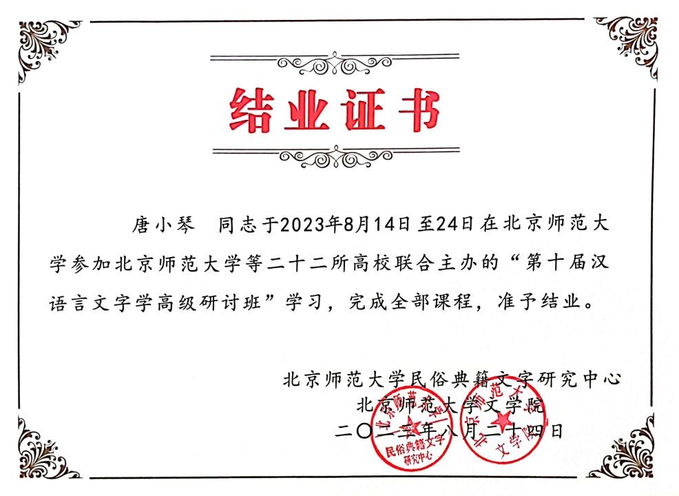 2023年8月14日,由北京师范大学、北京大学等二十二所高校和商务印书馆联合主办,北京师范大学承办的第十届汉语言文字学高级研讨班在北京师范大学敬文讲堂隆重开班,2023年8月24日顺利闭幕。成都文理学院文法学院语言学教研室青年教师唐小琴参加了本次研修培训学习并顺利结业。