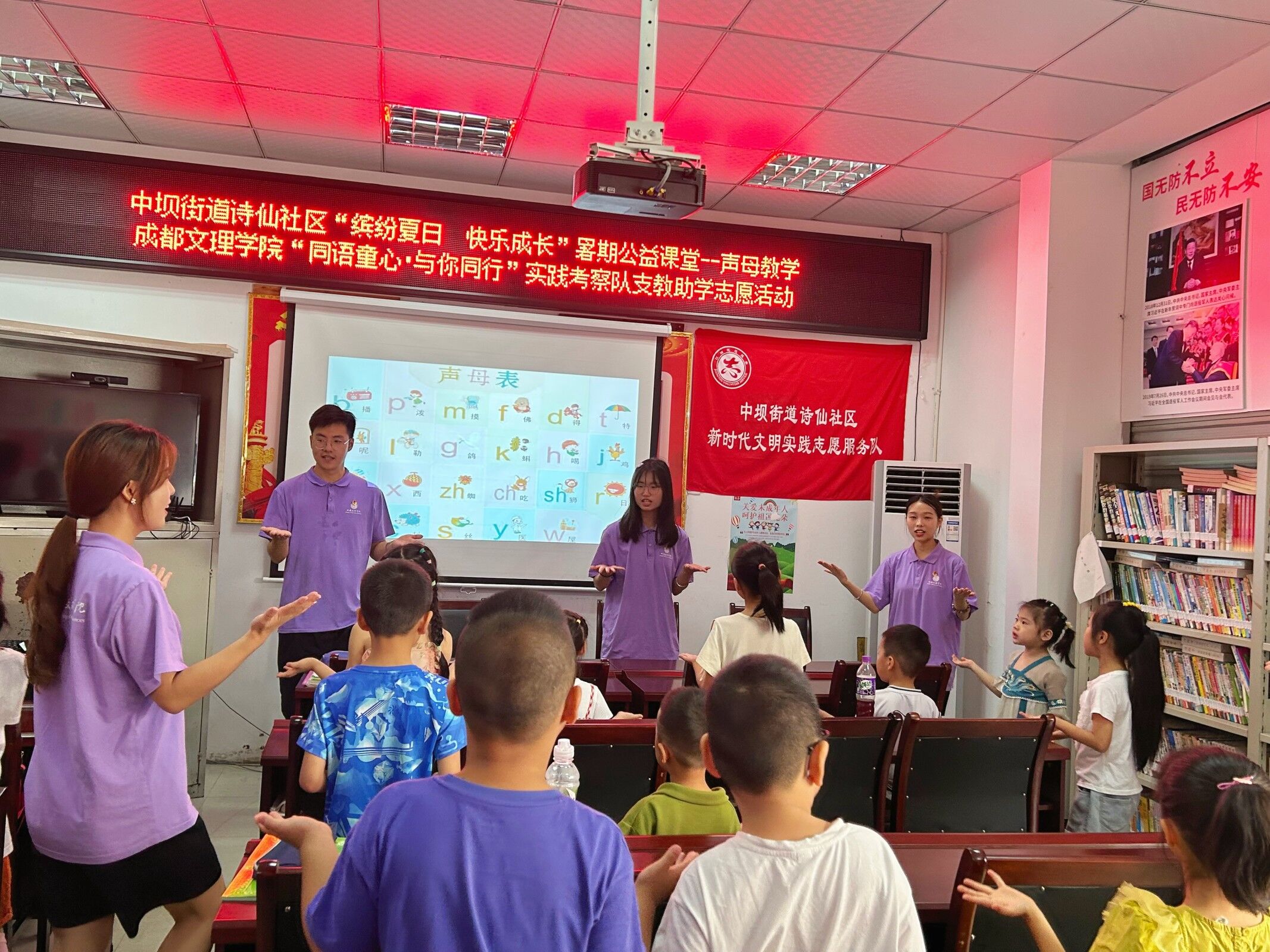 为全面落实国家语言文字方针政策,弘扬中华民族优秀传统文化,提升幼儿的语言能力,增强全体师生语言规范意识和推广普通话意识。7月5日,成都文理学院文法学院“同语童心·与你同行”实践考察队与江油市中坝街道党群服务中心在诗仙社区进行普通话声母教学工作。