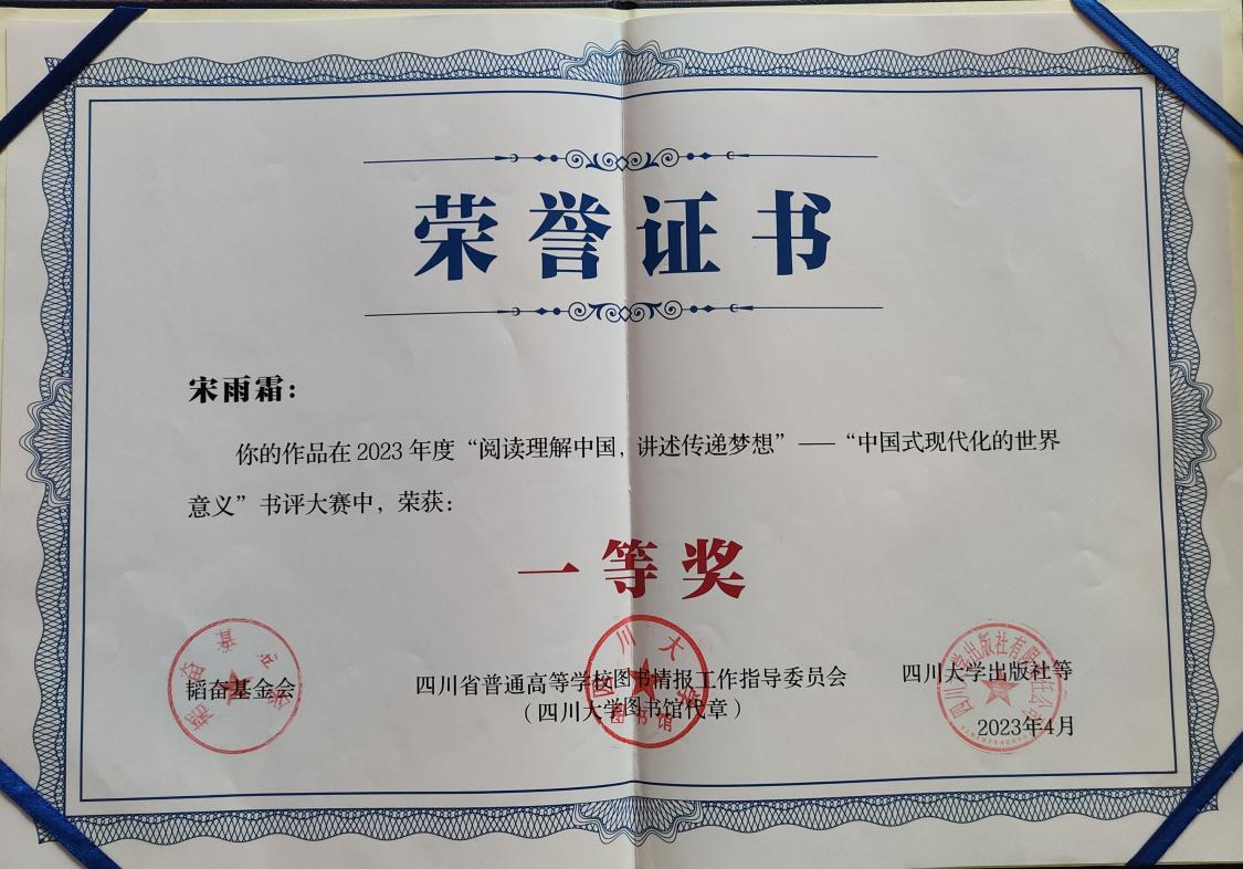 由韬奋基金会、四川省普通高等学校图书情报工作指导委员会指导,四川大学出版社、四川大学文学与新闻学院(出版学院)等多家单位联合举办的“中国式现代化的世界意义”书评大赛颁奖典礼暨《阅读理解中国》新书首发式27日在四川大学举行。文法学院语文教育教研室写作课程负责人宋雨霜的文字书评作品获得一等奖。