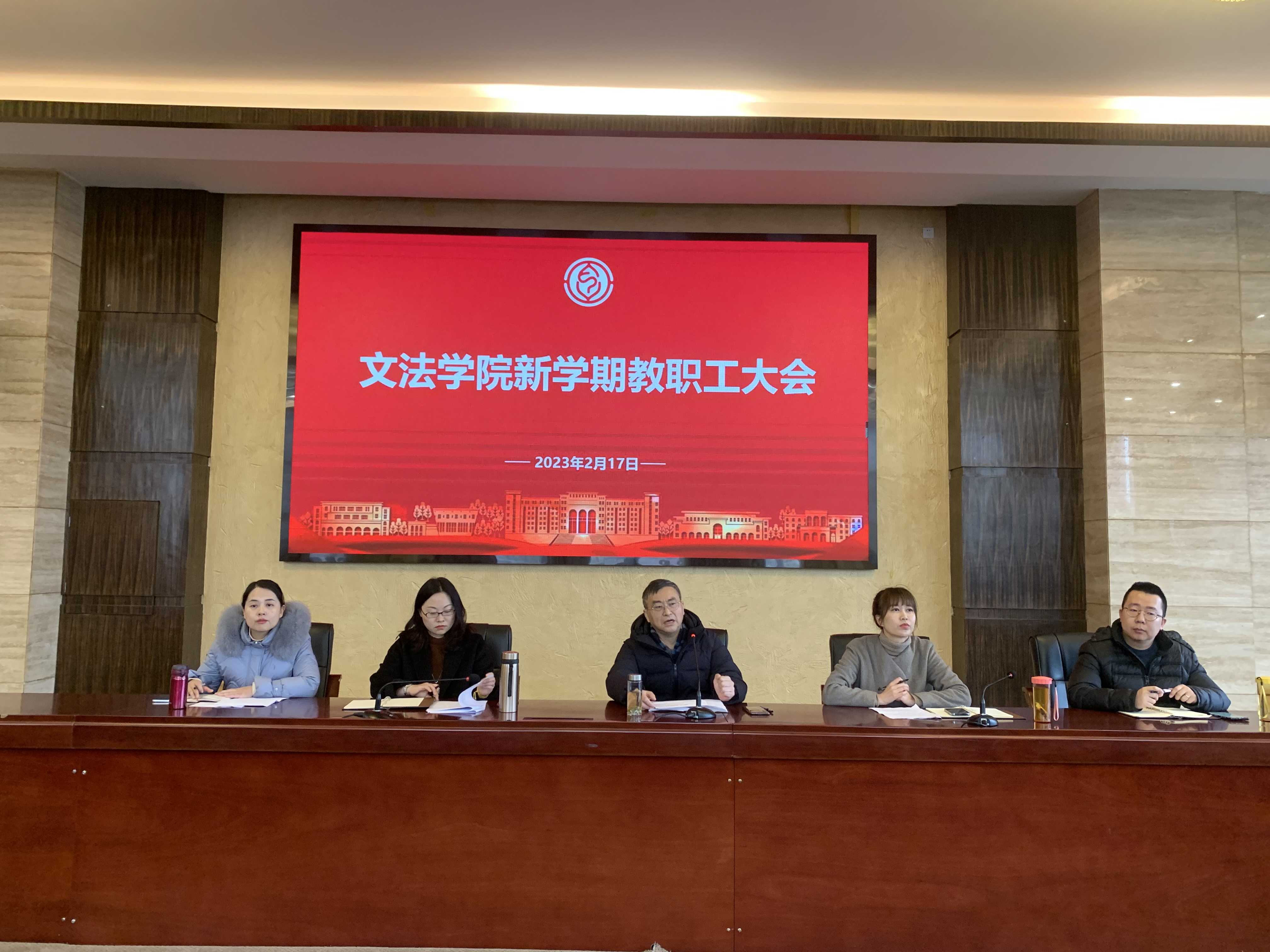 徐学东对过去一年的工作进行了回顾和总结,并对新学期工作提出要求。他谈到,过去一年里,文法学院狠抓教学改革,提高教学质量;积极营造科研氛围,提高学术水平;加快人才引进,加强队伍建设;关心关爱学生,鼓励成长成才,在教学、科研、招生就业、党建及队伍建设等工作中取得了良好成效。新年伊始,全体教职员工要以党的二十大会议精神为思想引领,以本科教学评估任务为中心,以教学、科研、学生管理等为重点,全力做好各项工作。教职员工要增强主体责任意识和担当意识,要发扬吃苦耐劳、积极贡献和勇于创新的精神,爱岗敬业、积极作为,为学校学院的发展贡献力量。
