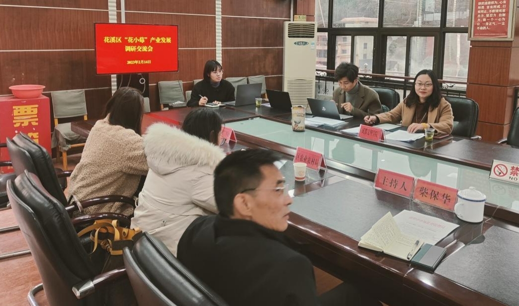 2月14日,在花溪区市场监督管理局会议室,通过现场交流与问卷填写,获取“花小莓”的产品规模、产量、销量、经济价值、带动就业、产业链条等信息,并深入草莓种植基地进行现场参观、访谈。