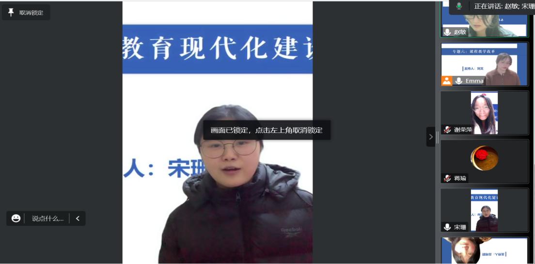 教育现代化建设专题由宋珊老师主持并作报告,其他老师就报告内容进行讨论。宋老师首先介绍了教育部高教司司长吴岩阐述的进入普及化阶段的高等教育的四大特征分别是多样化、学习化、个性化、现代化,接着就教育现代化特征介绍了其主要内容体现为“八个现代化”,尤其强调“教育观念现代化”是所有现代化目标的先导。然后其他老师就管理机制、人才培养模式、育人范式等具体内容的现代化推进和落实进行自己的理解、思考和分享,阐述了如何才能切实达到人才质量提高的目标。