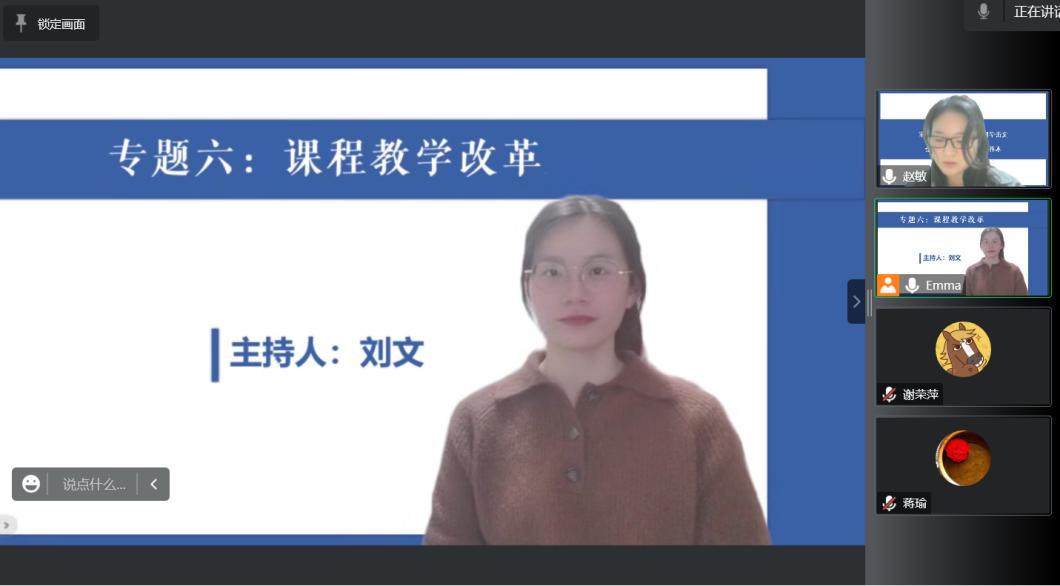 课程教学改革专题由刘文老师主持并作报告,其他组员老师就实现改革目标结合自身教学提出建设性意见。刘老师解读了“以学生为中心,以实际工作过程为导向”的课程教学改革标准和为培养应用型人才“教学做一体化”的教学模式。王娟老师就“以成果为导向”的“OBE”教育理念,提出本课程作为思想文本解读型课程,在具体授课中应首先明白本堂授课要教给学生什么东西,教授内容最好是方便学生运用于实践的知识,而不是过于抽象的概念。段燕老师从中国现当代文学史课程的讲授特点出发,根据金课“两性一度”的标准提出自己对打造金课的理解,认为金课打造的关键是教师自身水平和学识的高度,因此自我提升是成就金课的必要环节。其他老师也就如何将课程文本、思想讲授引导学生联系生活实际分享自己的操作办法:有的老师通过设置课堂实际任务;有的老师通过攫取生活时事;有的老师通过课下作业实践。上述办法体现了老师们对课程改革的理解和落实。