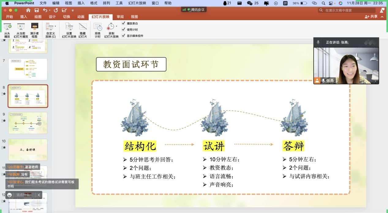 在面试环节这部分,分为结构化、试讲和答辩三个环节。张老师剖析了现今教资报考情况,由于报考人数剧增,导致每个环节都需要层层筛选。她建议同学们试讲时放慢语速,可以克服由于紧张引起的结巴和停顿。三个环节面试总时长为20分钟,张老师强调要合理利用时间。结构化环节内容与班主任工作相关,大约用时5分钟;试讲环节要注意教姿教态、语速和音量,大约用时10分钟左右;答辩环节的提问一般与试讲内容相关,大约用时5分钟。