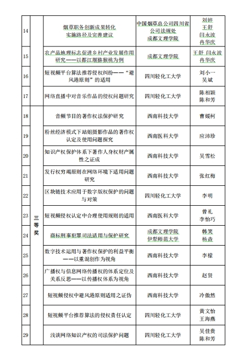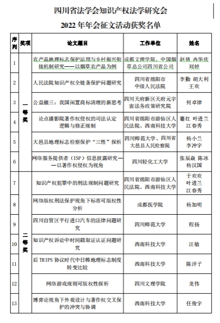 本次研讨会,我院教师收获颇丰,其中赵倩老师、冉华庆教授、刘婷处长(中国烟草总公司四川省分公司)合著论文《农产品地理标志保护运用与乡村振兴衔接机制研究——以烟草农产品为例》荣获一等奖;刘婷处长(中国烟草总公司四川省分公司)、王舒老师、闫永波老师、冉华庆教授合著论文《烟草职务创新成果转化实施路径及完善建议》荣获二等奖;王舒老师、闫永波老师、冉华庆教授合著论文《农产品地理标志促进乡村产业发展作用研究——以都江堰猕猴桃为例》荣获二等奖;韩笑老师、杨垚老师(伊犁师范大学)合著论文《商标刑事犯罪司法适用与保护研究》荣获三等奖。