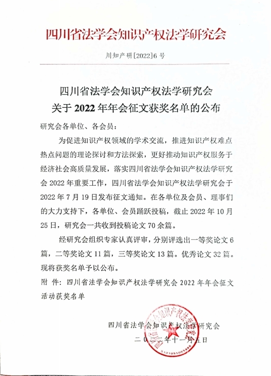 本次年会征文获奖,充分肯定了我院教师一年以来在知识产权相关领域理论研究和实践工作取得的成绩,为我院同省内其他高校的学术交流、科研合作提供了良好契机,也为实现我院知识产权学科高质量发展奠定了坚实基础。