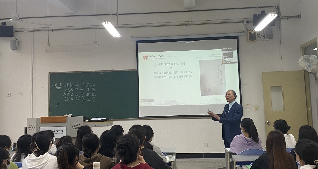 其次,黎教授鼓励同学们多多锻炼自己的写作能力。黎教授一直以来专注于把国学研究与近体诗创作相结合,近体诗写作近百首,以此勉励中文系学生创作近体诗。该班学生上台展现了自己以《郑伯克段于鄢》为素材创作的近体诗,颇有想法,慕名来听课的大三学生做了点评,生生互动,学习氛围良好。接着,黎教授做了补充并展示了他立足于本篇课文创作的两首近体诗,立意高远,对仗工整,大家无不为黎教授的才情倾倒,拍手叫好!