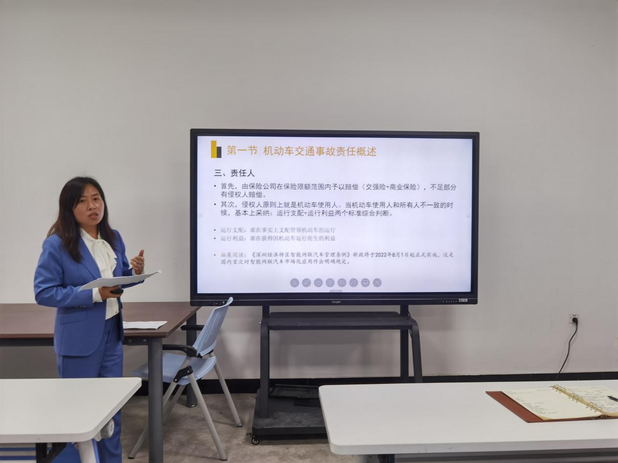 2022年10月20日下午三点,应用法学教研室在A117教室开展“精彩一课”院级公开示范课活动,由应用法学教研室张淑芬副教授进行《侵权责任法》一课的示范教学,全体法学教师参与听课学习。张老师讲解了特殊侵权中有关机动车交通肇事侵权行为的构成要件,结合司法实践中的重难点,详细地对机动车交通事故进行了定义和分类。张老师凭借自身丰富的司法实务经验,通过引入司法案例,使得课堂生动而富有感染力。针对张老师的示范课内容,冉华庆副院长、淡乐蓉老师、鲍明明老师等分别做出了精彩的点评。