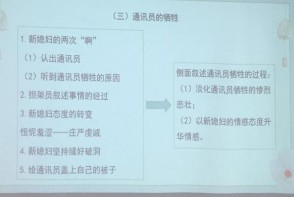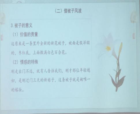最后,王老师通过鉴赏讨论法,设置“新媳妇为何将被子盖在通讯员身上”、“百合花的象征意义”等三个问题,引导学生发散思维,深度解读文本,探求作品的文学魅力。