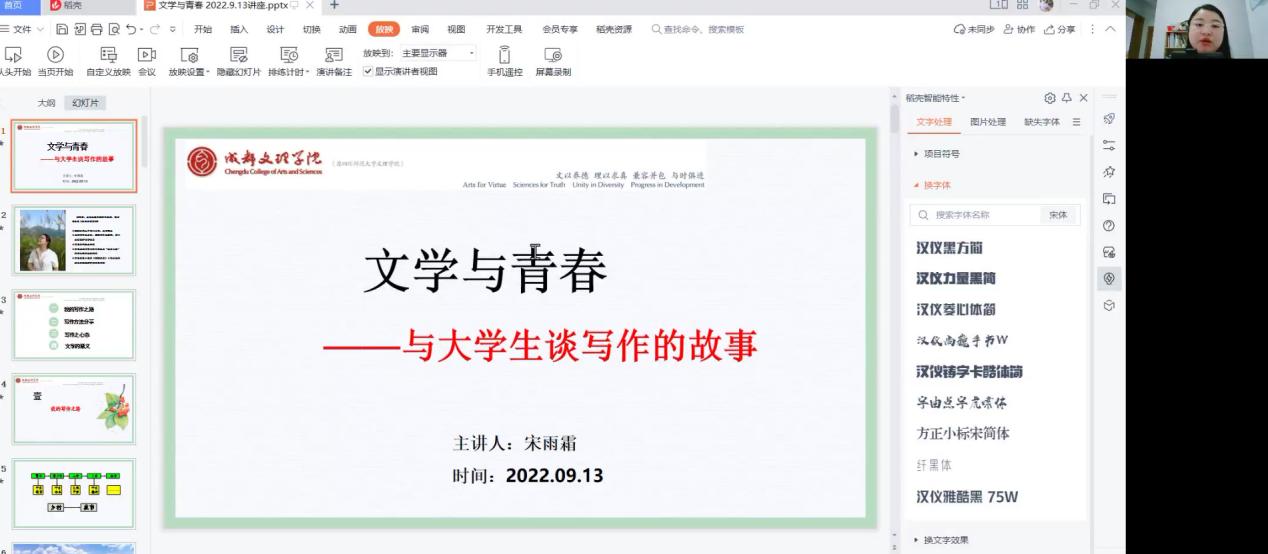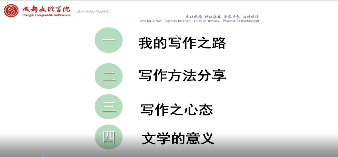 9月13日上午9点半,文法学院宋雨霜老师开展“文学与青春——与大学生谈写作的故事”线上讲座。宋雨霜老师是语文教育教研室写作课程负责人,成都市作协会员,著有散文集《生命的芭茅花》。此次讲座,她从写作之路、写作方法、写作心态、文学的意义四个方面和同学们进行了经验交流。