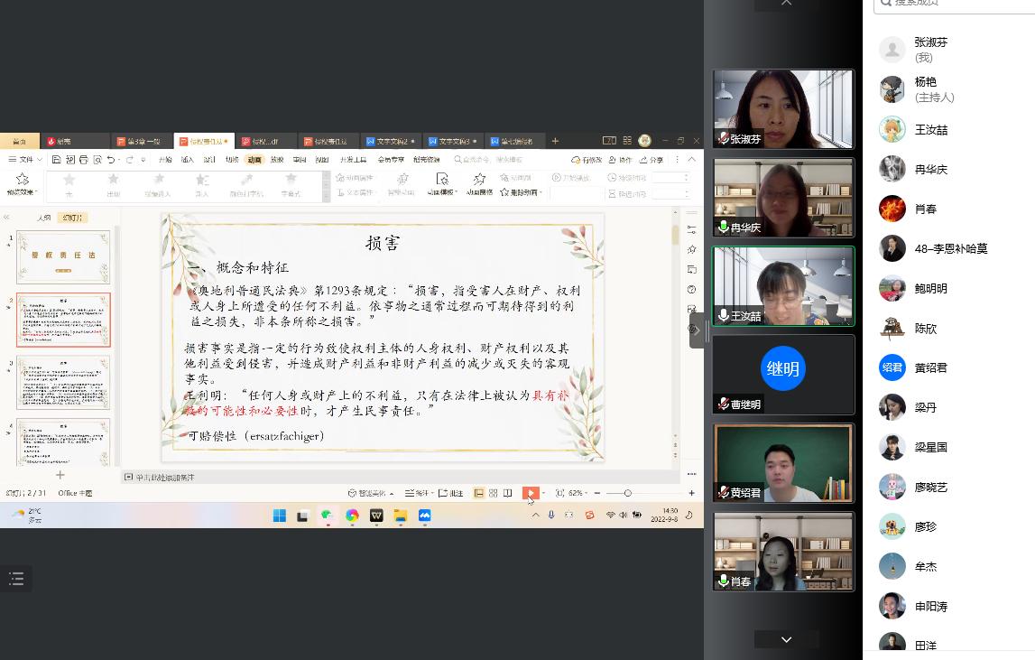 按照学校下发的《关于开展2022-2023-1学期“磨课”专项工作的通知》要求,文法学院应用法学教研室开展2022-2023学年第一学期“全员磨课,打造精品”的“磨课”专项工作。9月8日下午1:30,文法学院应用法学教研室开展本学期第二轮磨课专项活动,受疫情的影响,本次磨课活动采取线上的形式开展。文法学院副院长冉华庆、校级教学督导曹继明、法学教研室主任肖春和教研室全体老师参加。文法学院副院长冉华庆主持此次活动。