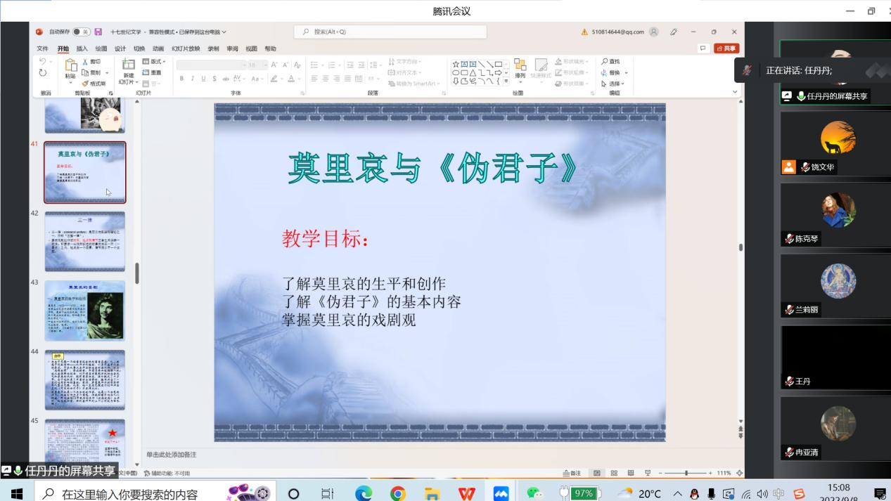 饶文华老师主持了本次磨课活动,各位老师按照既定安排依次进行了说课和授课。谢荣萍老师主要讲授了有关“塞万提斯的生平与创作”方面的内容,任丹丹老师主要讲授的是“莫里哀与《伪君子》”,陈克琴老师由于本学期承担了两门本科课程,故分别讲授了“古典主义文学概述”和“‘愤怒的青年’与文学反叛意识”两部分的内容。在每位老师完成课程讲解后,各位老师对几位老师的讲课均进行了发言与点评,针对具体的细节问题都提出了宝贵的意见与建议。