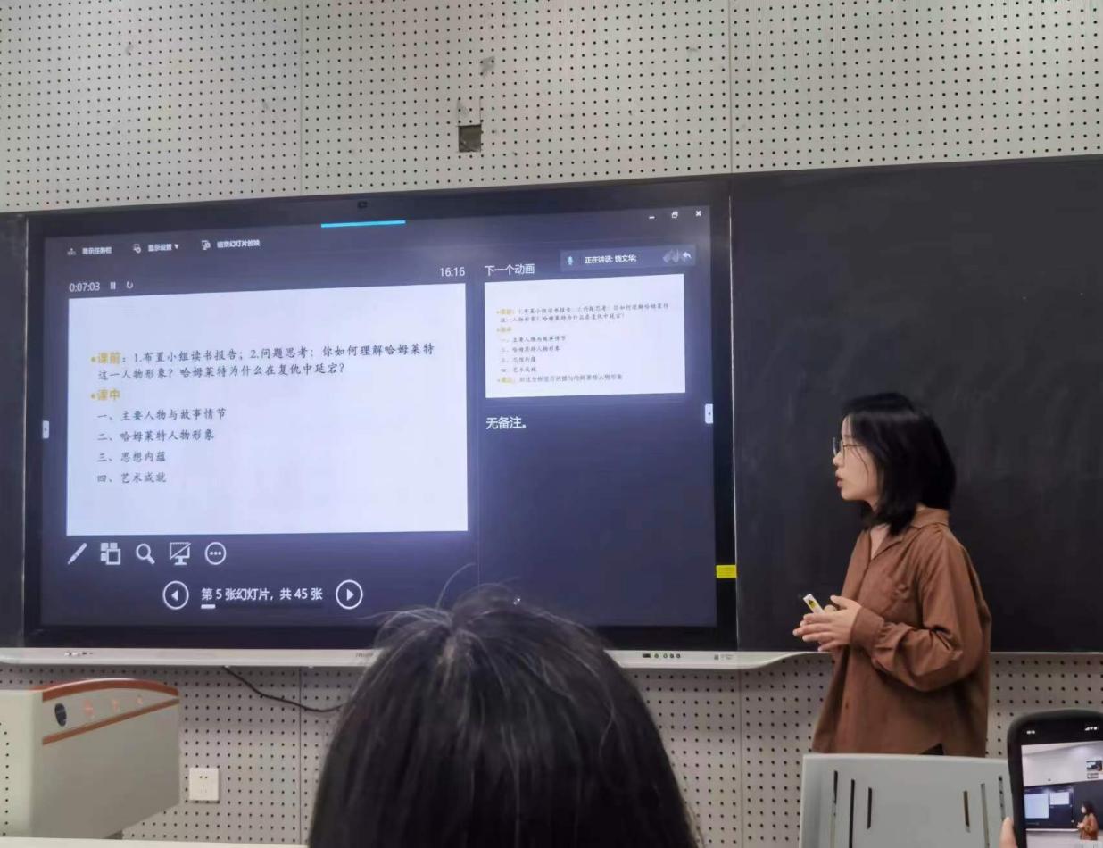 谢荣萍老师主持了本次会议的流程,外国文学课程组的老师们依次进行了说课和无生授课。王丹老师主要讲授了有关《哈姆莱特》的课程内容,饶文华老师讲解了堂吉诃德形象的版块,兰莉丽老师梳理了莎士比亚的创作,冉亚清老师讲述了《哈姆莱特》的相关知识点。在每位老师完成课程讲解后,各位老师对四位老师的讲课均进行了发言与点评,针对具体的细节问题都提出了宝贵的意见与建议。
