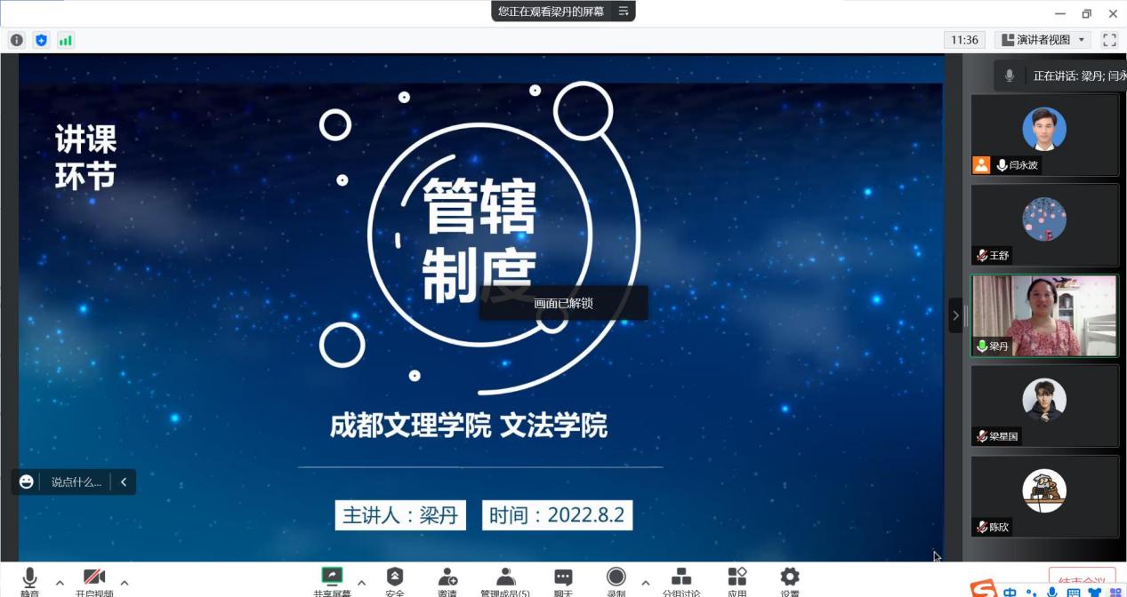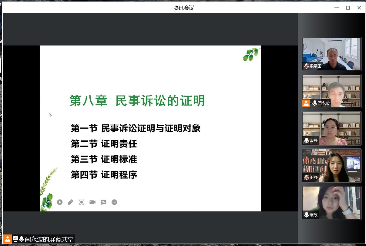 2022年8月2日,文法学院应用法学教研室《民事诉讼法》课程组开展线上磨课活动。本次磨课活动由闫永波老师主持,梁丹老师、陈欣老师、梁星国老师、王舒老师参与。