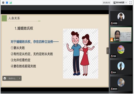 廖珍老师对《婚姻家庭与继承法》课程进行了说课、讲课展示,围绕“夫妻关系”一章的内容,对婚姻姓氏权、家事代理权、忠诚协议等内容进行了授课讲解。其注重对教学设计理念的展现,润物细无声地融入课程思政元素,结合学生的专业进行课程设计,授课思路清晰,教学设计环环相扣,课件元素丰富,将视频资料生动清晰地带入教学内容。