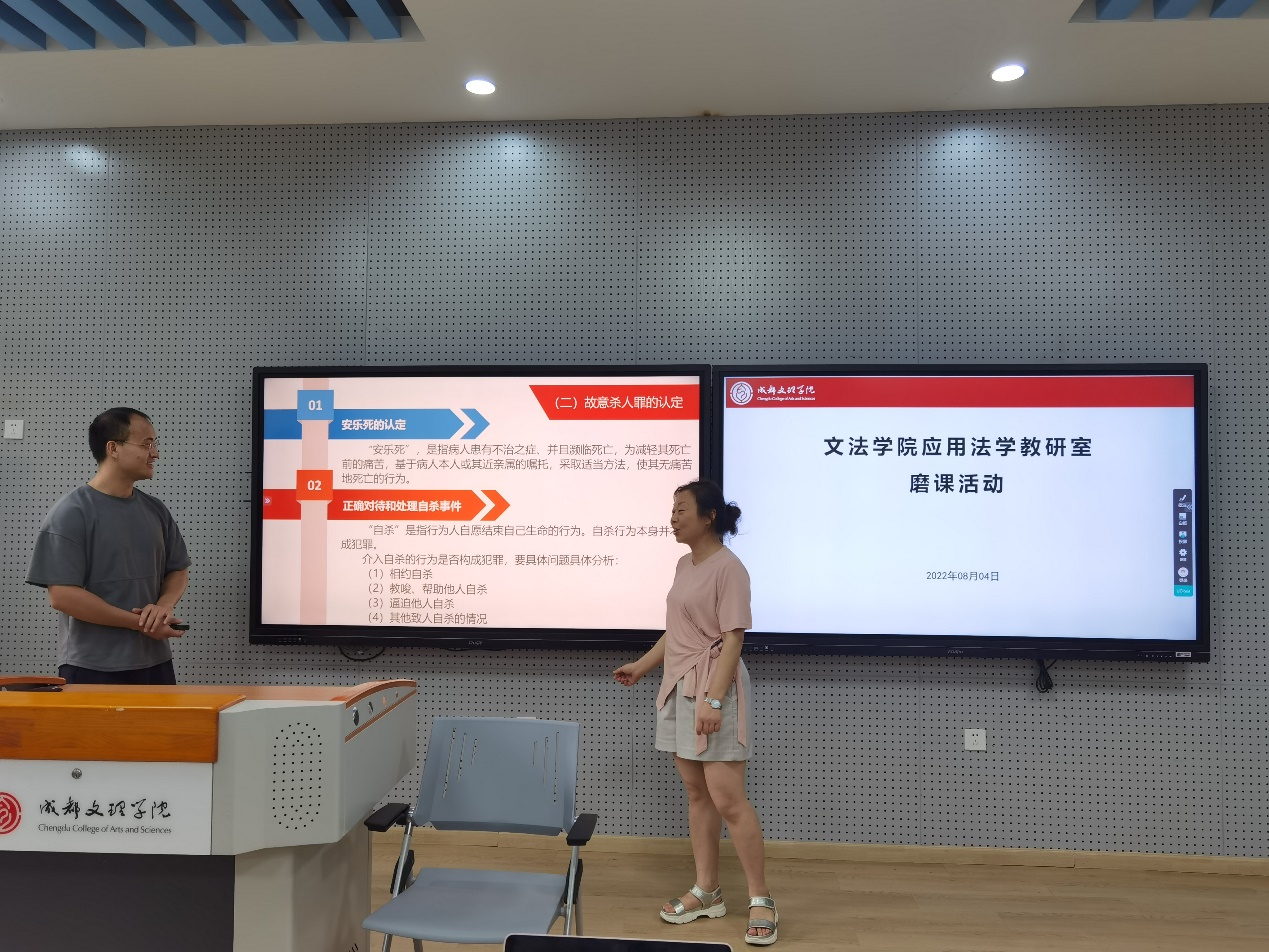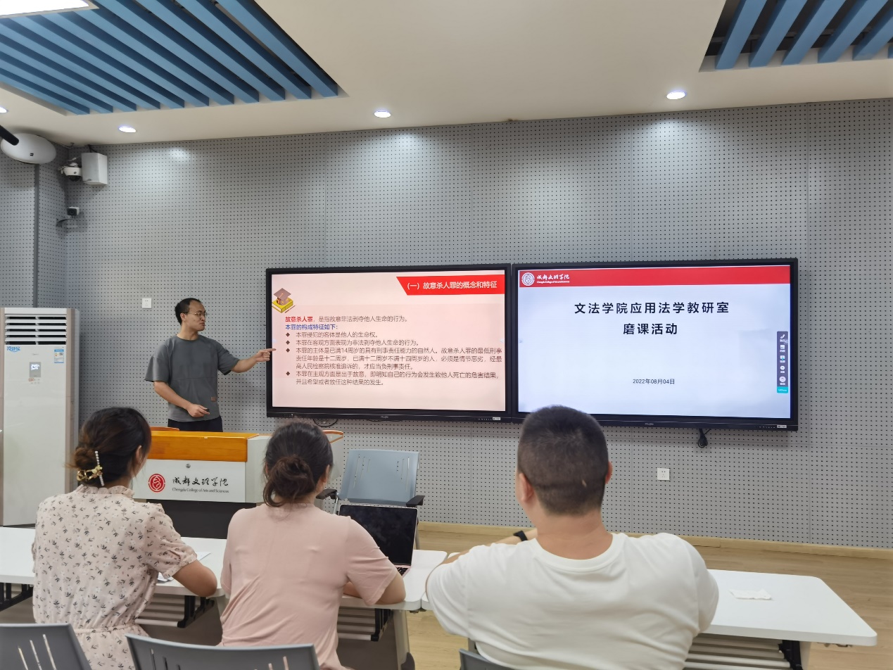 2022年8月4日,文法学院应用法学教研室再次开展磨课活动,重点研讨《刑法分论》课程和《婚姻家庭与继承法》课程的讲授。活动由应用法学教研室主任肖春主持,校级教学督导曹继明副教授全程指导,教研室全体教师参加。