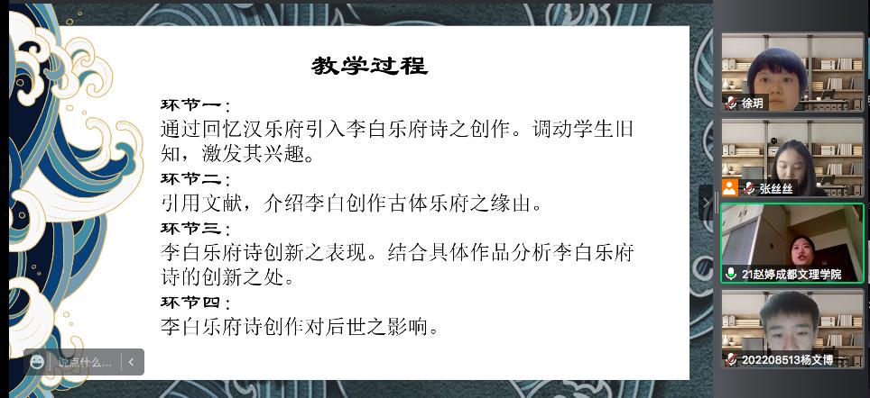 为了进一步深化教学改革,全面提升教师教学能力和业务水平,提高教学效率和教学质量,文学与语言学教研室中国古代文学课程组在8月3日下午开展了磨课活动。