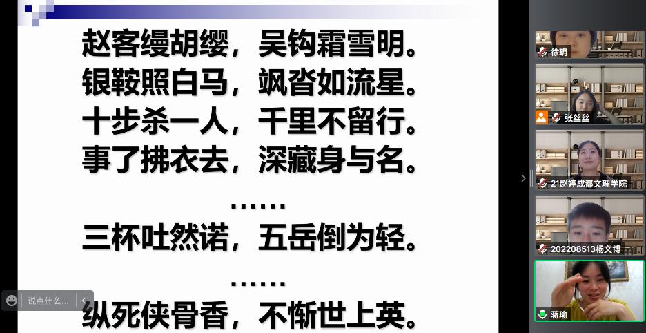 本次磨课活动共有说课、讲课、互评、总结四个环节。首先,参加磨课活动的全体老师结合教学内容分别进行了8分钟的说课,在学情分析、教材分析、教学目标定位、教材内容处理、教学方法选择、教学过程设计、课后作业布置等方面,在全组教师面前做了详细阐述。随后,各教师按照要求选择教学内容,分别进行了45分钟的实际课堂讲授展示:赵婷老师以李白乐府诗为主题,对李白乐府诗《行路难》进行了精彩的解读;杨文博老师生动而详细地阐释了李白的生平经历与思想;张丝丝老师以问题导入新课,对李白的生平和思想进行了生动的介绍;徐玥老师对李白《行路难》进行了细致的分析和解读;蒋瑜老师则全面展示了关于李白的授课内容和教学设计,全方位呈现出李白及其诗歌的魅力,让参与磨课的年轻老师受益匪浅。每位老师讲授完成后,其余老师都对该老师的优缺点进行点评。比如,可以采用提问等方式与学生互动,调动学生的积极性;PPT版面设计需要简洁大方,字体大小需适中,保证学生能一目了然;授课语速应不紧不慢,语言表达要流畅、优美。