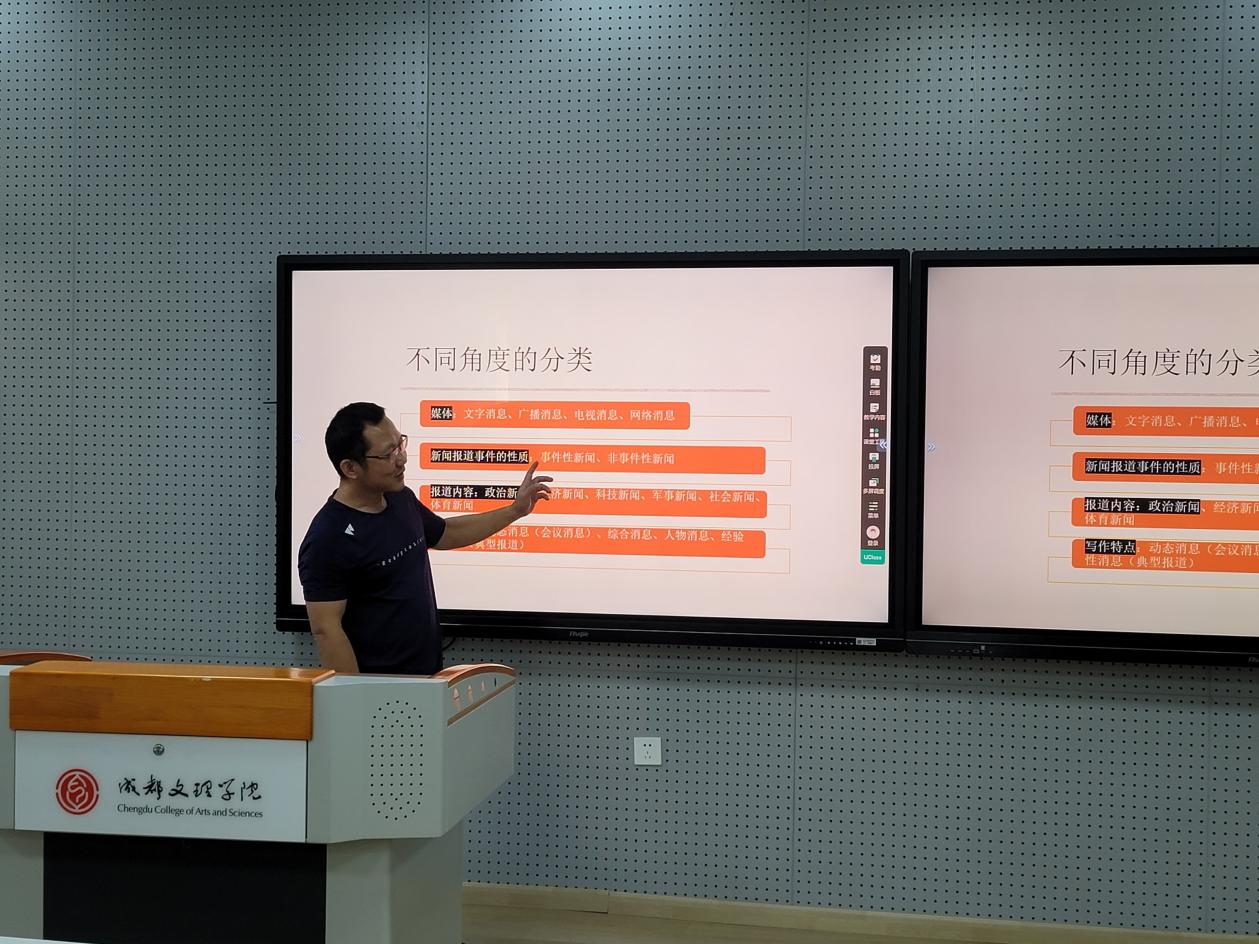 此次活动由文秘与文化传播教研室主任陈诗、教研室副主任刘波主持。以《新媒体概论》《新闻采访与写作》《秘书技能与实务》《办公自动化》四门课程为主要磨课对象。在说课过程中,各位老师对教材、学情、教学方法、教学过程、学生考核等方面进行了阐述。在《新媒体概论》课程的授课试讲中,文化传播方向的向秋婷老师就“传统媒体的求生之路”进行了讲授、朱世雄老师就“媒介融合”部分的内容进行了试讲。在《新闻采访与写作》中,由刘宛欣老师和李华老师就“消息的写作”部分的内容分别进行了讲解。文秘方向的课程《秘书技能与实务》由李凯老师进行了“信息工作”知识点的试讲,另外,李华老师对《办公自动化》中“word文档的图文混排”进行了授课。各位老师都进行了精彩的说课和试讲,具有鲜明的个人风格。