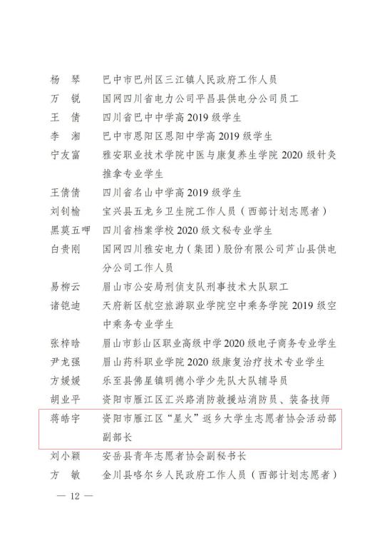 蒋皓宇,1998年8月出生,共青团员,四川省资阳市共青团雁江区委“星火”返乡大学生志愿者协会部长,四川省四星级志愿者。2021年12月被四川省精神文明建设办公室评为“四川省百名优秀志愿者”,2021年12月被共青团四川省委评为“逐梦计划”大学生社会实践活动优秀实习生,同年获共青团四川省委、四川省学生联合会“四川省大学生综合素质A级认定”,主持四川省大学生创业创新项目三项,其中一项获四川省铜奖,两项通过校级立项。