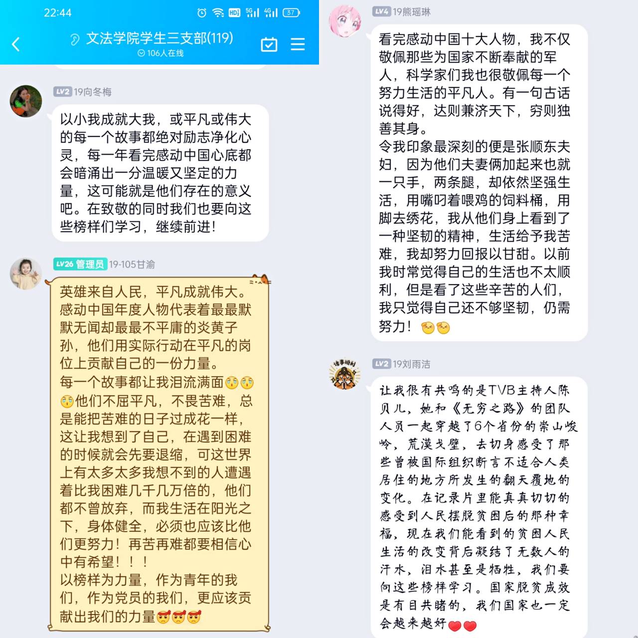 2022年3月3日晚,文法学院组织师生观看“感动中国”2021年度人物颁奖盛典,全体师生通过线上模式在“央视新闻”观摩学习,共同致敬向上的力量。