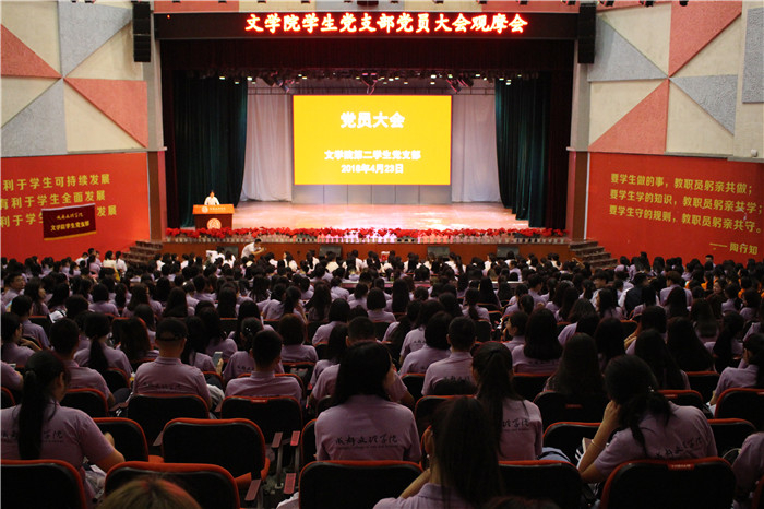 4月23日中午12:30,文学院学生党支部党员大会观摩会于星空剧场顺利举行。此次会议由第一学生党支部书记肖媛、第二学生党支部书记林丽玥主持。文学院党总支书记、学工办主任陆明烨、全体辅导员老师、16名正式党员、13名预备党员以及2017级文学院全部同学参与此次观摩会。