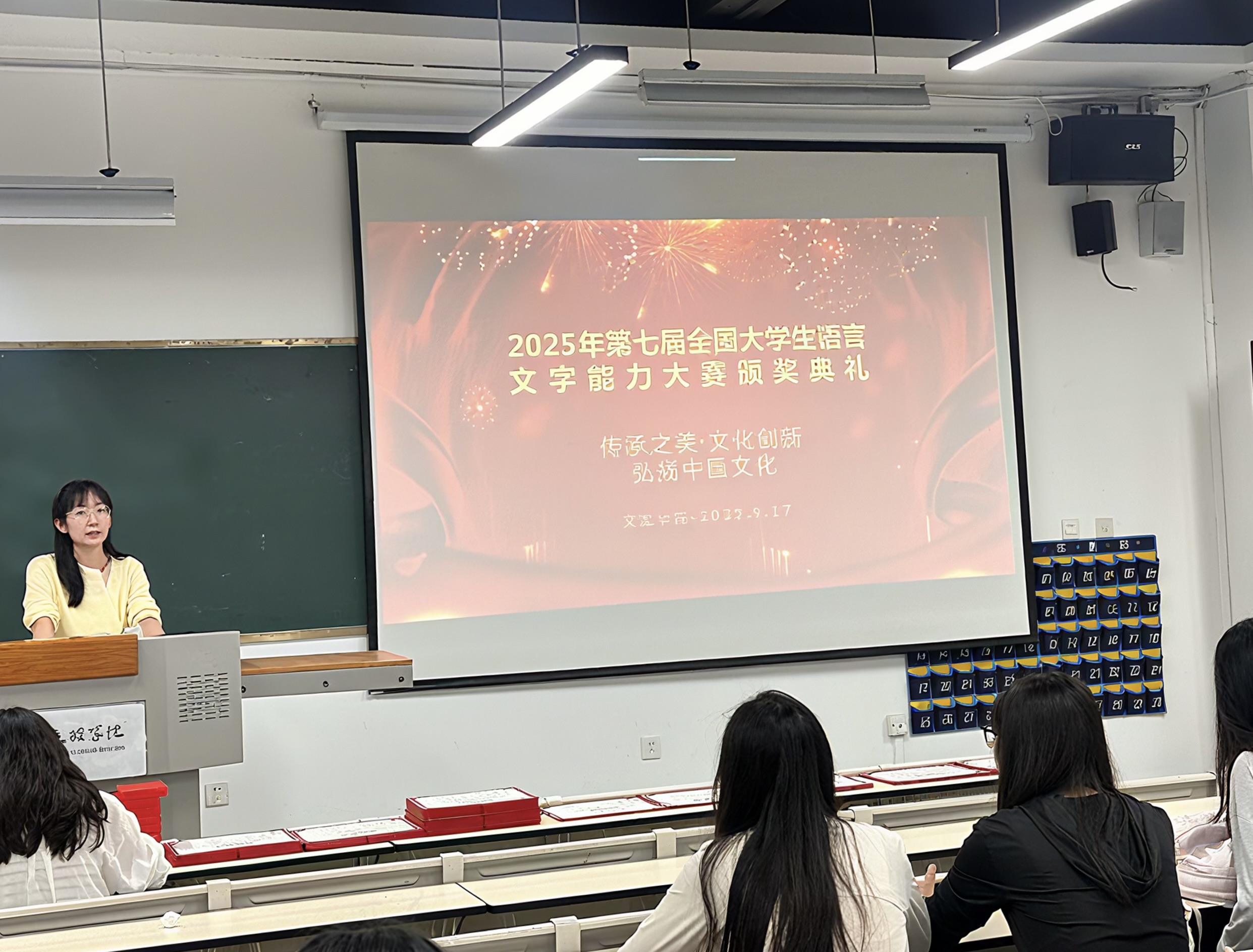 2025年9月17日下午13时,第七届全国大学生语言文字能力大赛颁奖仪式在B101教室隆重举行。指导教师代表与全体获奖学生齐聚现场。作为学院语言文化建设的重要活动,大赛以“提升大学生语言文字运用能力、传承中华优秀语言文化”为核心目标,自启动以来便吸引众多学生踊跃参与,最终涌现出一批优秀获奖者。