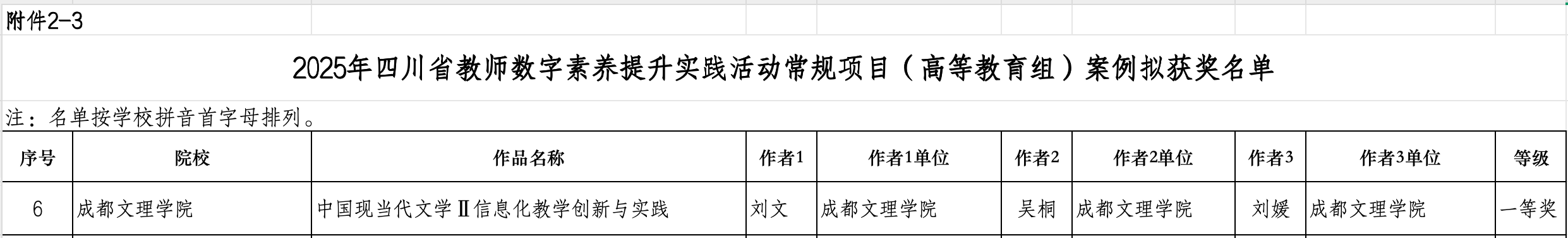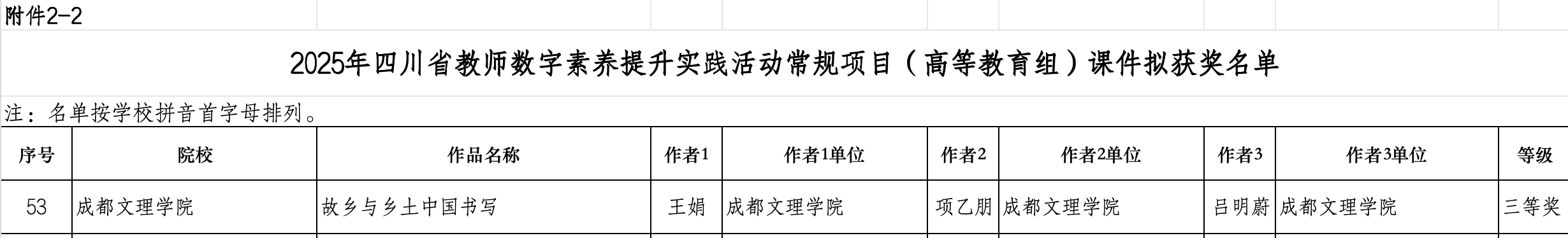 近日,2025 年四川省教师数字素养提升实践活动获奖公示落下帷幕。本次活动由四川省教育厅主办,旨在提高教师数字素养,深化课程教学改革。活动分为常规项目和其他专项两个项目,包括课件、微课、案例三种类型作品。经过全省作品严格评审,刘文老师团队的案例《中国现当代文学Ⅱ信息化教学创新与实践》获得省级一等奖,王娟老师团队的课件《故乡与乡土中国书写》获得省级三等奖。