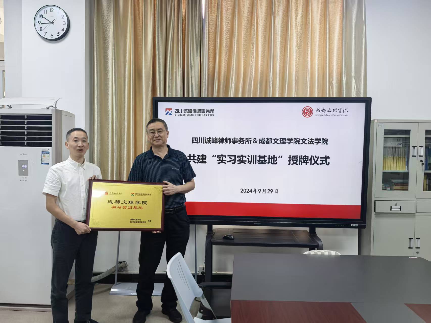 仪式上,文法学院院长徐学东教授与四川诚峰律师事务所主任蒋风云共同为“实习实训基地”揭牌。文法学院院长助理、应用法学教研室主任肖春,教师闫永波、王舒;四川诚峰律师事务所党支部书记、合伙人陈璨,合伙人蒋岩,专职律师陈凯、白婧雅等共同出席并见证了此次签约授牌仪式。