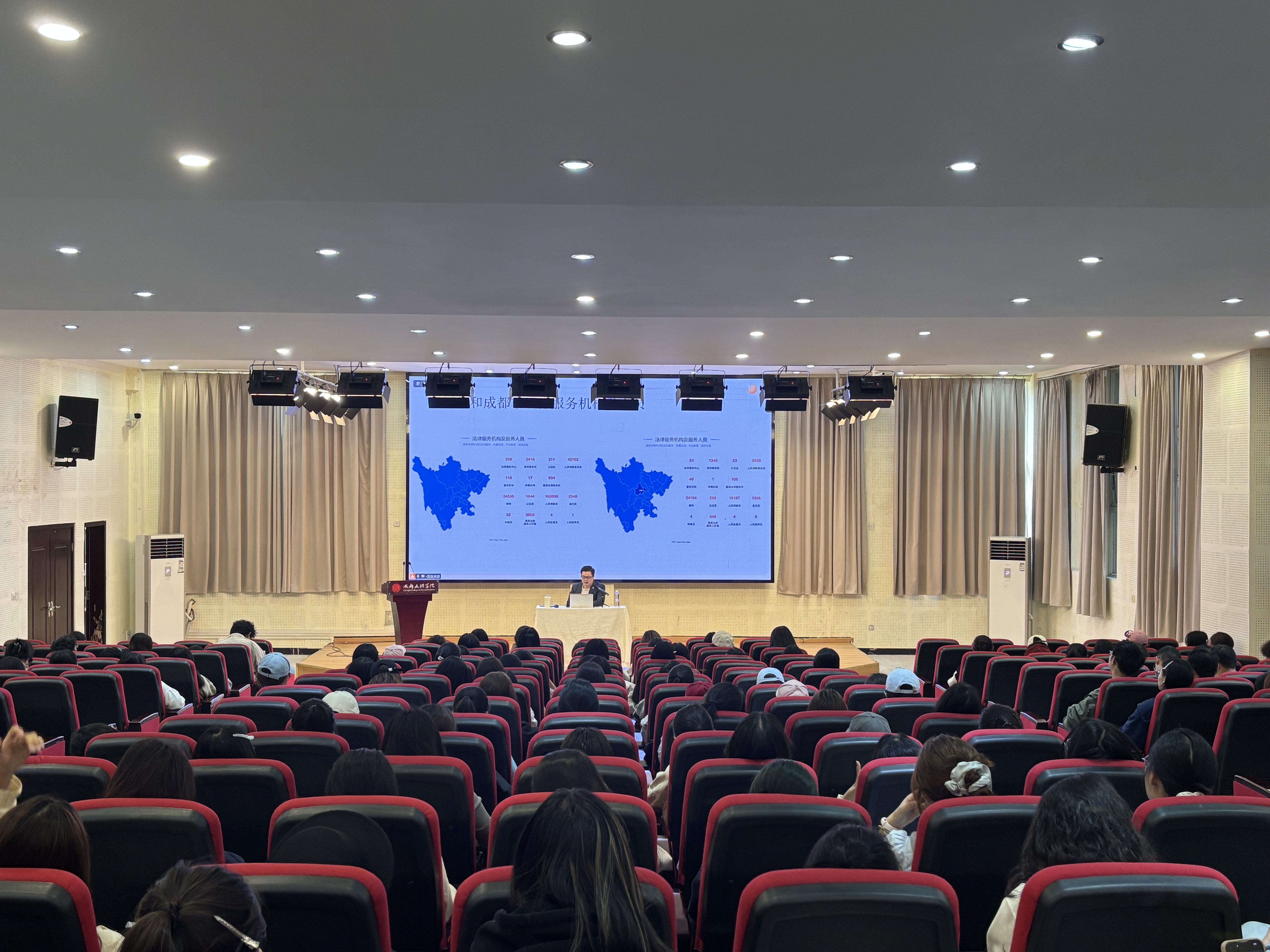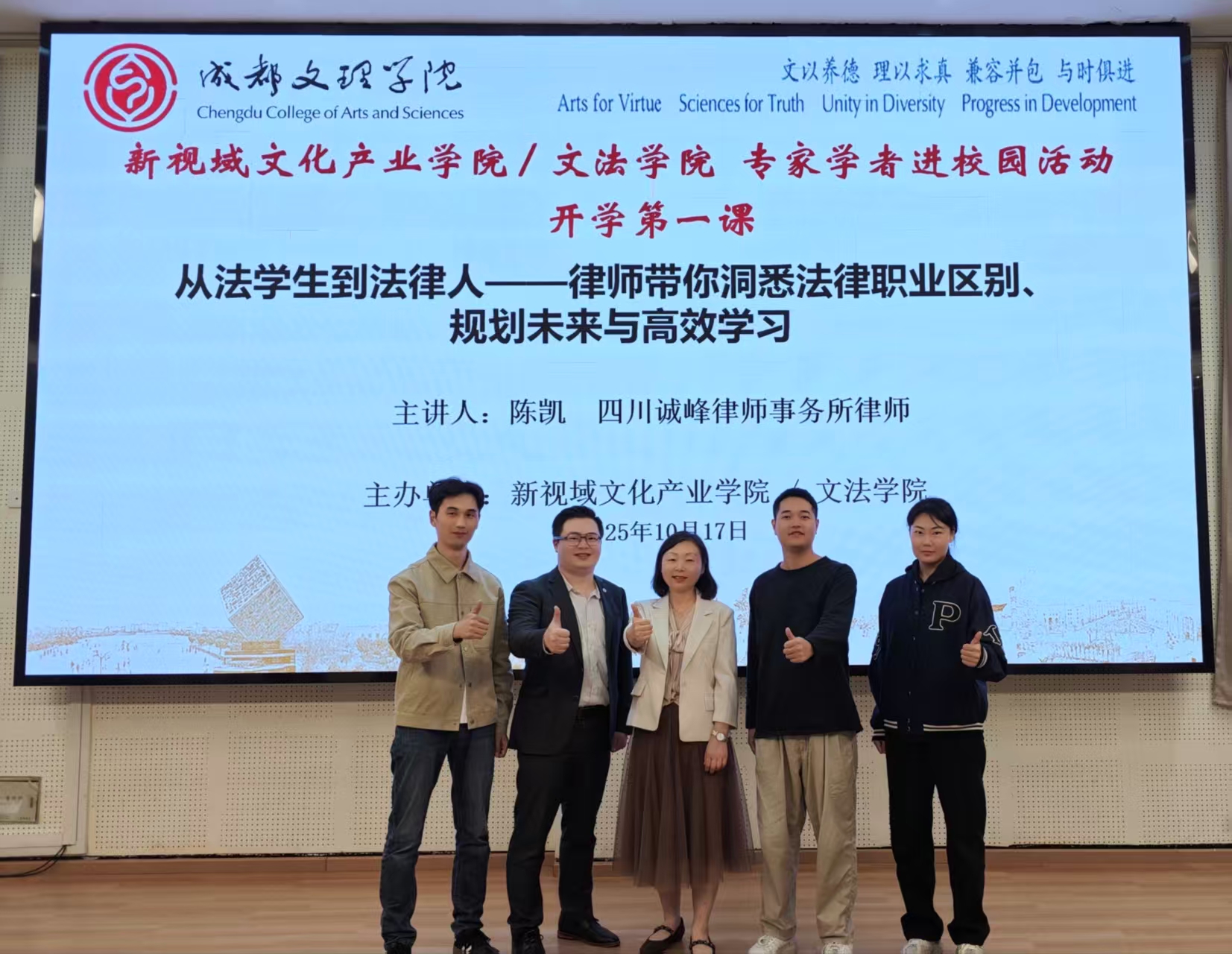 2025年10月17日,成都文理学院新视域文化产业学院与文法学院联合举办的“开学第一课·从法学生到法律人”专题讲座,在学工楼105成功举行。本次讲座特邀四川诚峰律师事务所陈凯律师担任主讲人。文法学院院长助理肖春、教师代表闫永波等出席讲座。2025级法学专业全体新生采用“线上+线下”的方式参加讲座。讲座由文法学院黄绍君老师主持。