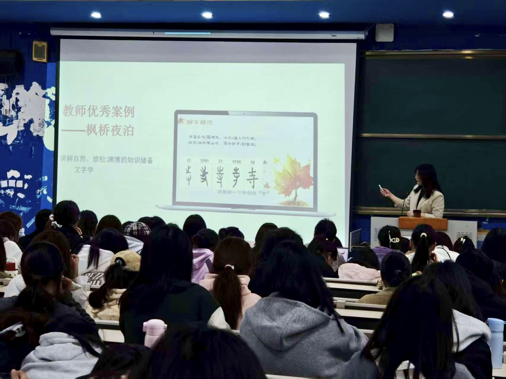 在案例分析环节,袁倩老师以《枫桥夜泊》为例,展示了如何运用扎实的知识储备实现自然讲解,并通过吟诵这一非遗传承形式体现创新特色。她强调,创新不是标新立异,吟唱、服饰、小剧场等多种形式均可尝试。