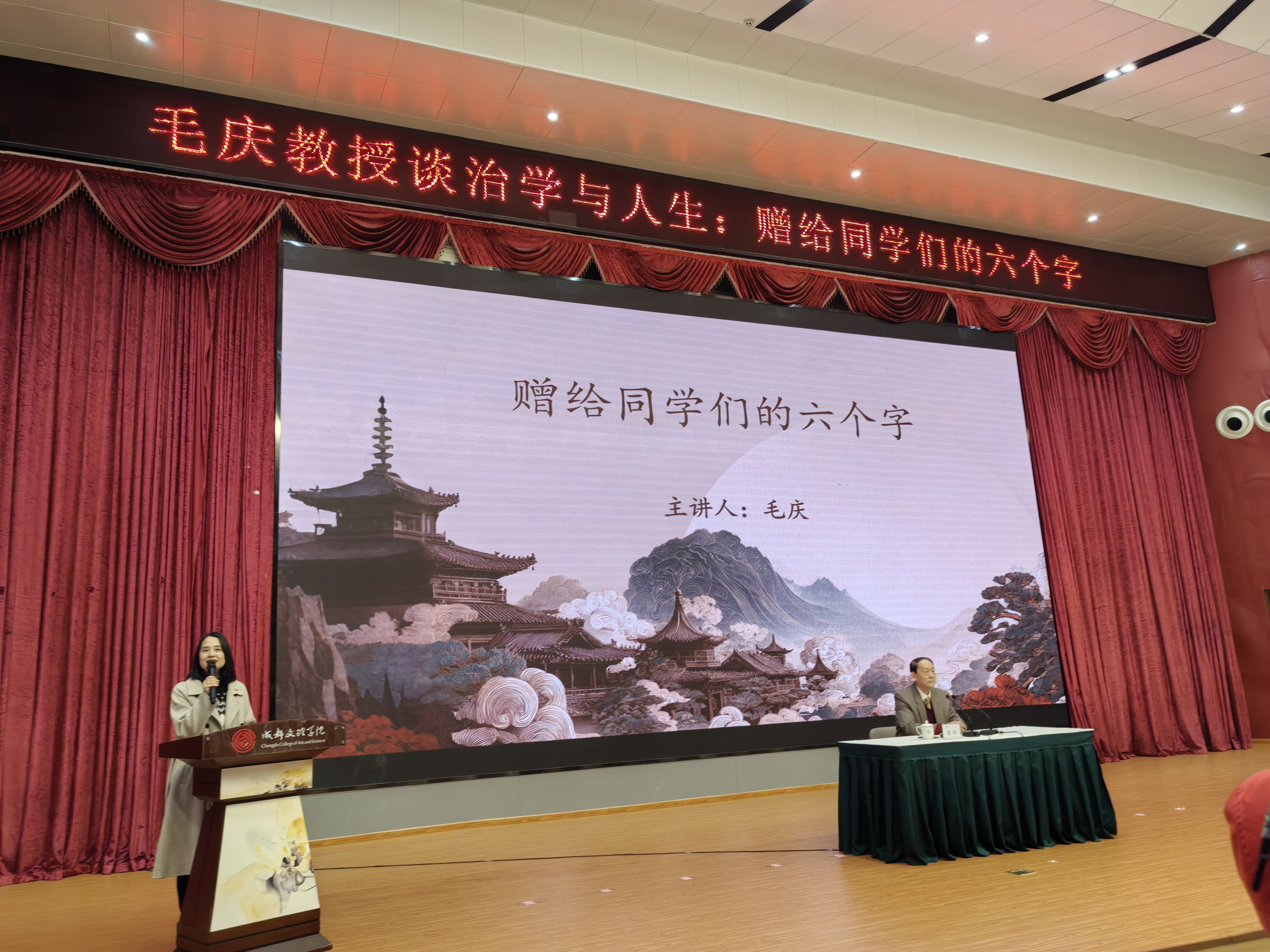 2025年11月12日,著名楚辞学者毛庆教授莅临文法学院,以《毛庆教授谈治学与人生:赠给同学们的六个字》为题,为师生带来一场精彩讲座。毛教授以其深厚的学术造诣和丰富的人生阅历,与在场师生分享了“选择、思考、坚持”这六个字背后的人生智慧。