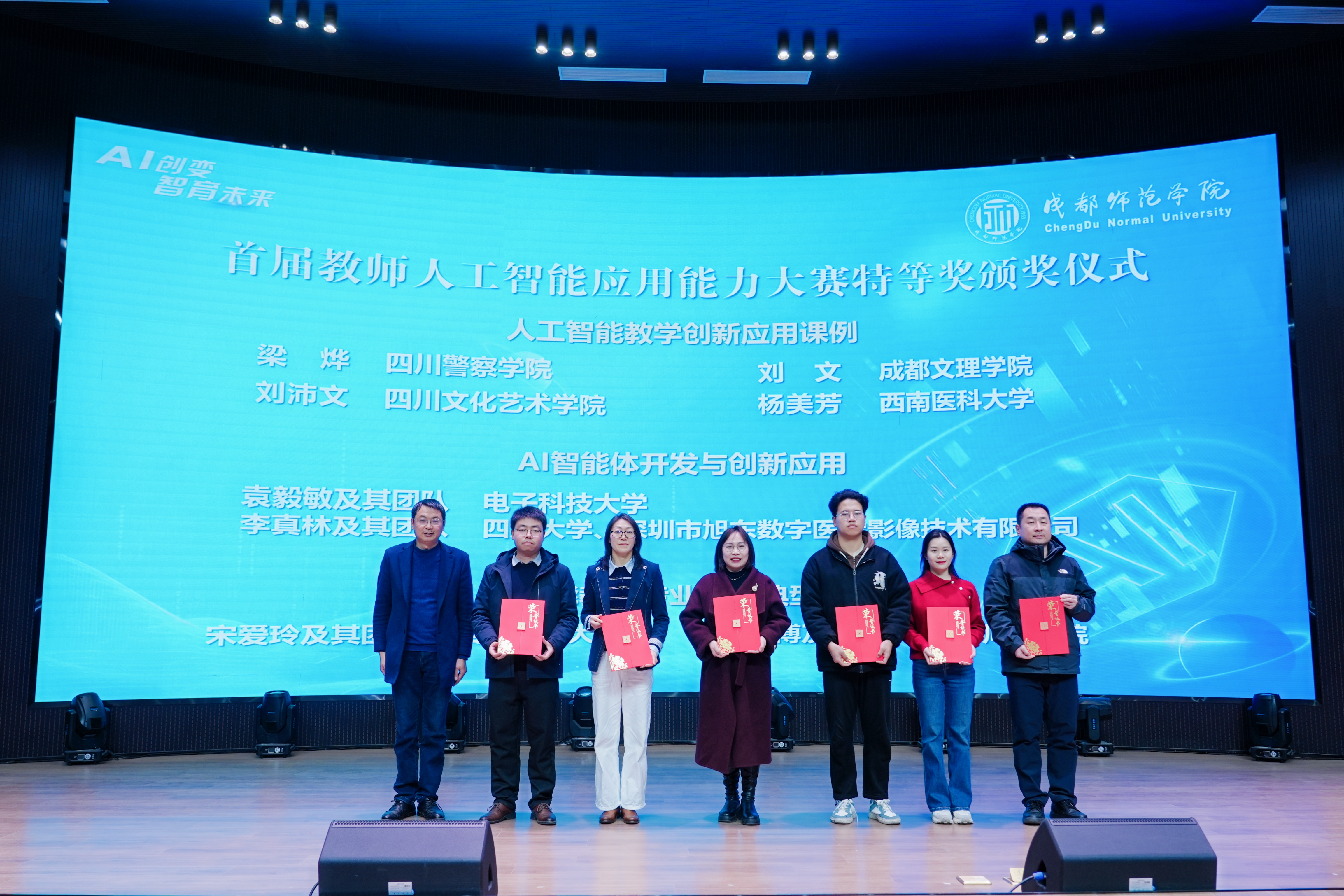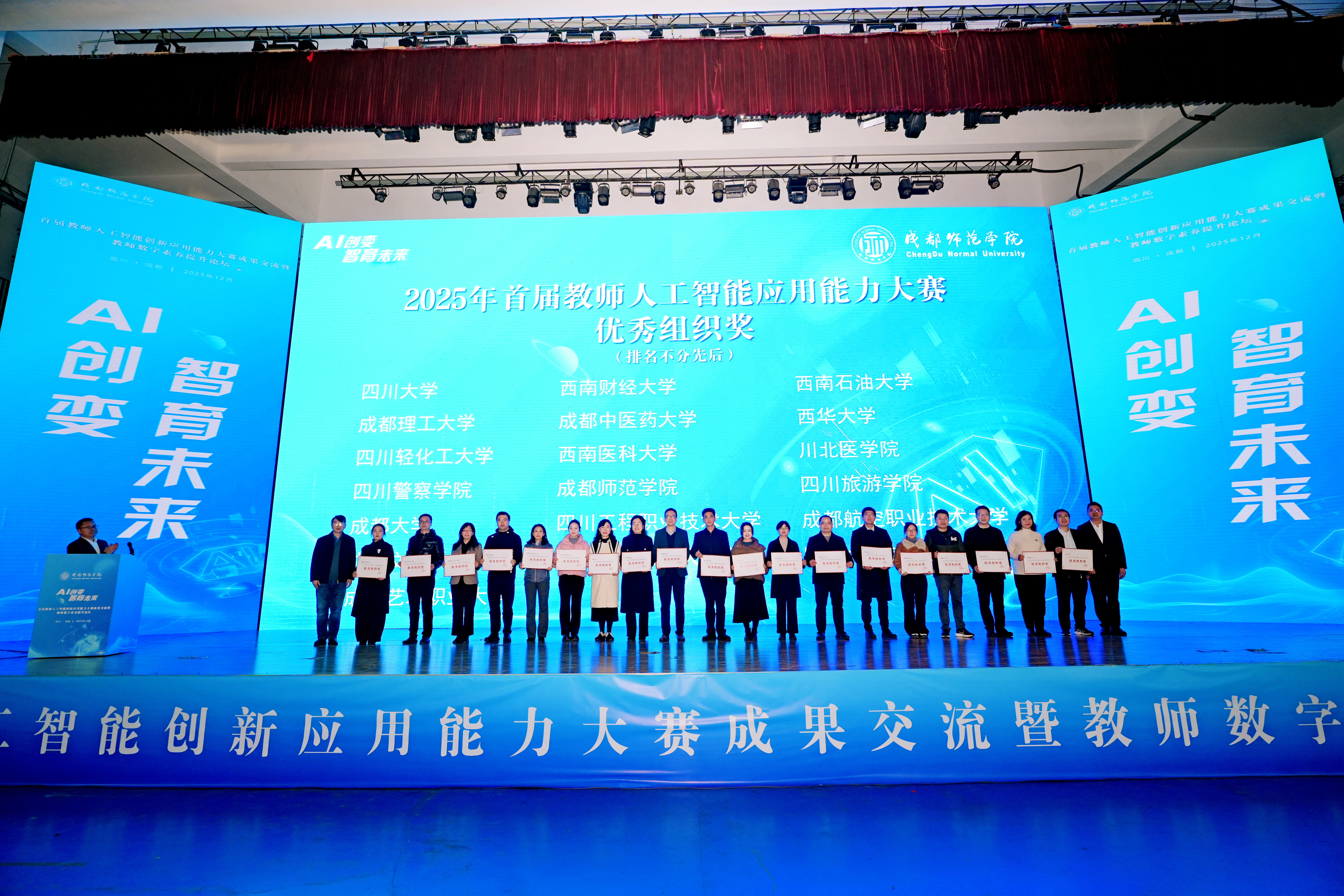 12月25日,由四川省教育厅指导、成都师范学院主办的“首届教师人工智能创新应用能力大赛成果交流暨教师数字素养提升论坛”在成都师范学院温江校区举行。本次论坛以“AI创变 智育未来——人工智能助力教师队伍建设”为主题,汇聚了全省各级各类教育工作者,共同探讨人工智能教育应用与教师数字素养提升的新路径。文法学院获奖教师受邀参加本次论坛,成都文理学院因组织工作出色、参赛成绩优异,荣获“优秀组织奖”。
