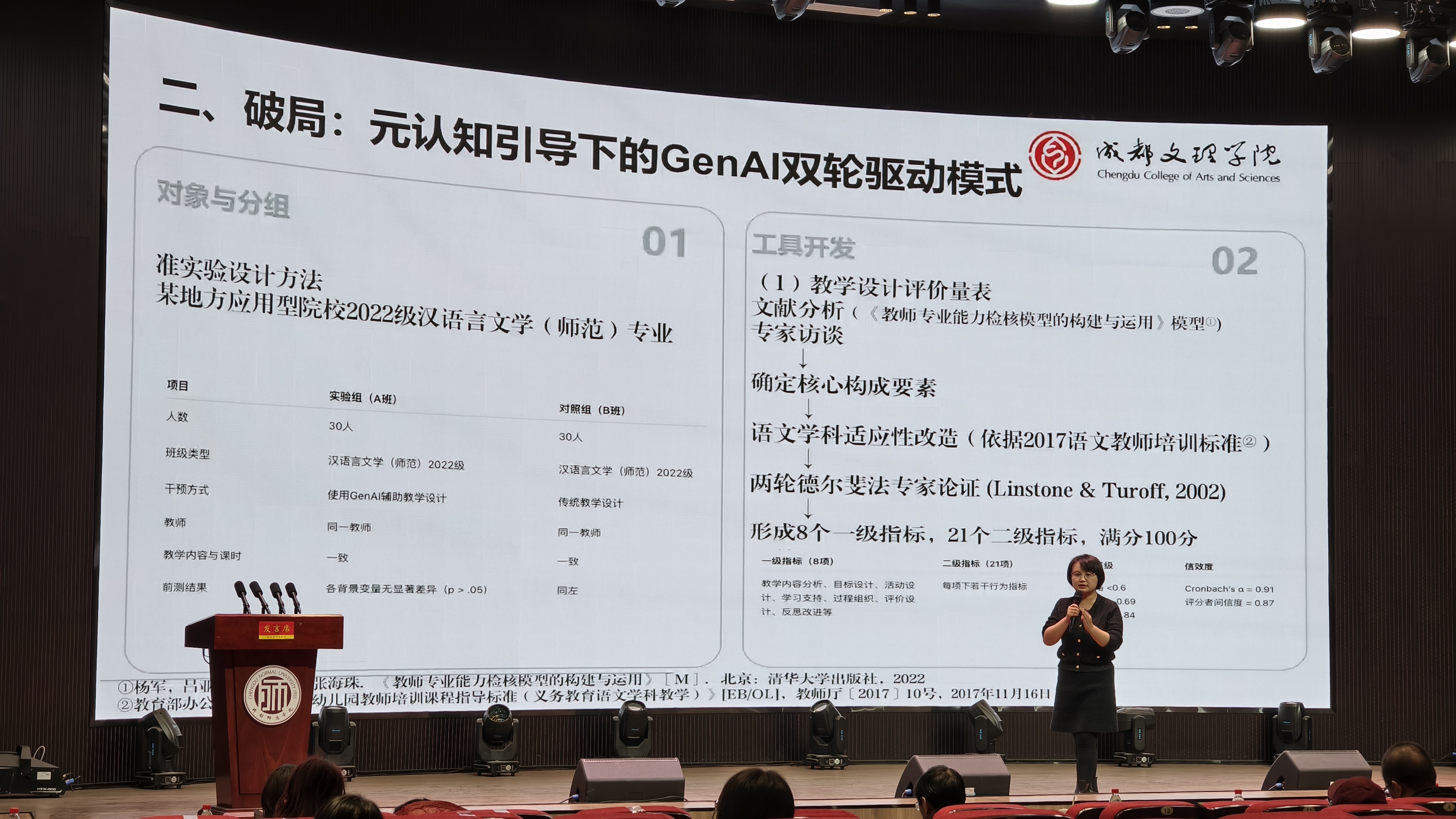 论坛期间还举行了大赛颁奖仪式。成都文理学院新视域文化产业学院教师刘文的大一汉语言文学专业《中国现当代文学Ⅱ》获高等教育组“人工智能教学创新应用课例”方向特等奖,并作为该方向代表上台领奖;杨娟教授的课程《AIGC教育应用》荣获同组别、同方向三等奖;陈越老师团队的《元认知引导下的AI辅助职前教师专业发展——教学设计能力提升》获高等教育组“AI赋能教师专业发展典型案例”方向特等奖。