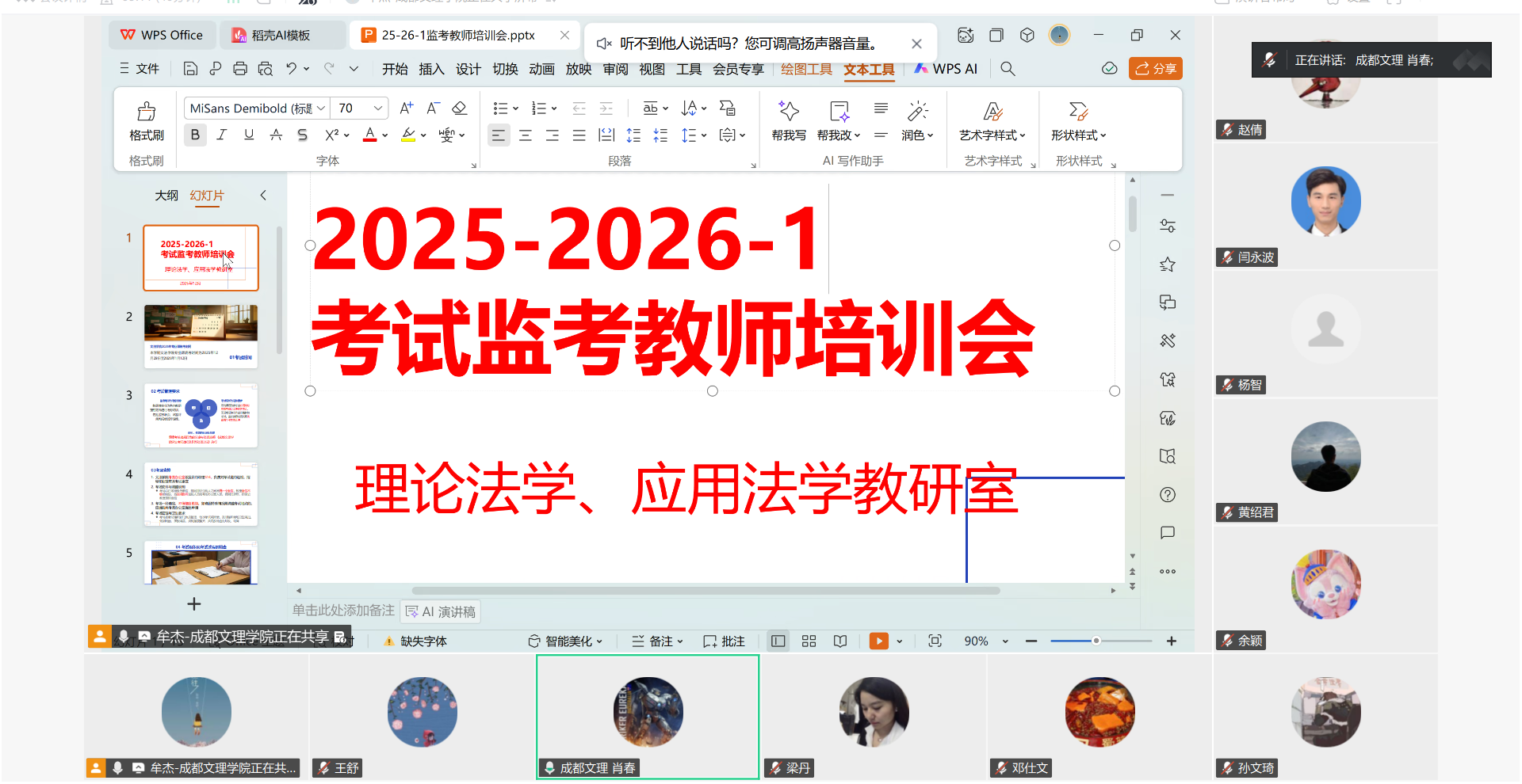 为确保2025-2026学年第一学期期末监考工作规范、有序进行,应用法学教研室、理论法学教研室于2025年12月23日召开期末监考培训会议。应用法学教研室、理论法学教研室全体教师参加会议,应用法学教研室副主任牟杰主持会议。
