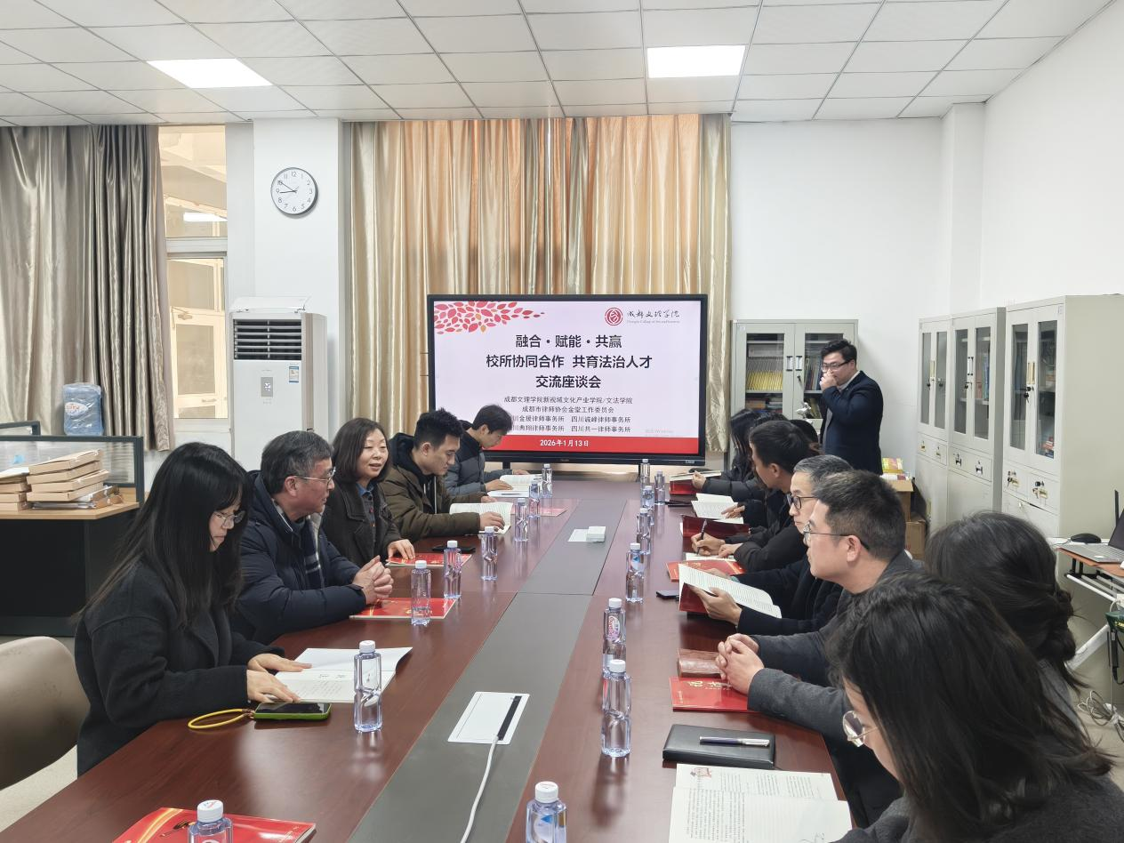 为深化法学教育与法律实务融合,创新法治人才培养机制,2026年1月13日,成都文理学院新视域文化产业学院、文法学院联合成都市律师协会金堂工作委员会及四川金援律师事务所、四川诚峰律师事务所、四川典翔律师事务所、四川共一律师事务所,在文法学院知识产权基地举办 “融合·赋能·共赢:校所协同合作,共育法治人才” 交流座谈会。