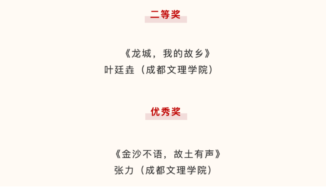 近日,第一届全国大学生汉语方言文化大赛获奖结果公示,成都文理学院文法学院学子在赛道二“方言原创演讲” 中斩获殊荣:叶廷垚同学的《龙城,我的故乡》荣获二等奖,张力同学的《金沙不语,故土有声》获评优秀奖,以乡音为媒传递文化力量。